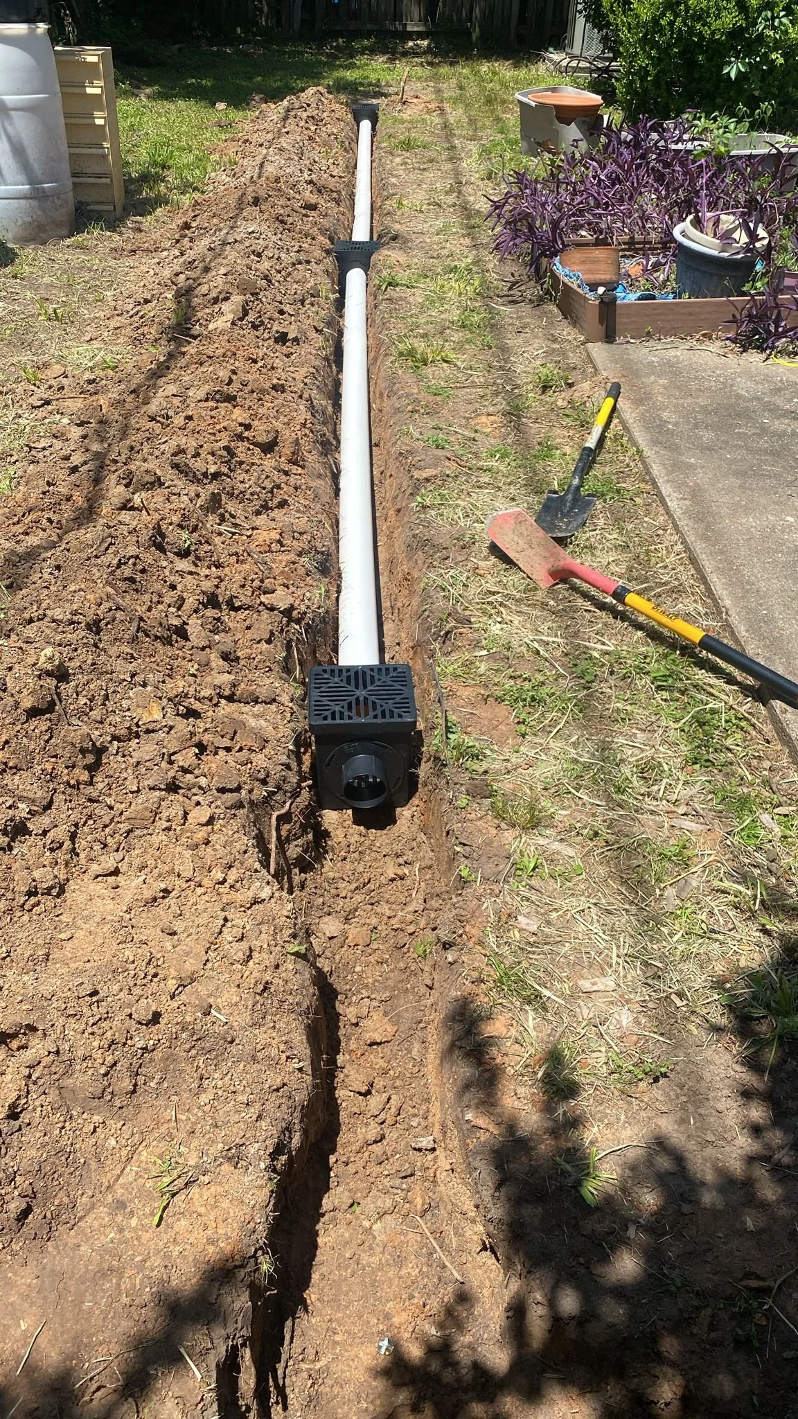 Connect Drainage Lines: We install PVC or corrugated pipe to carry water to a safe discharge location (e.g., pop-up emitter, French drain, street curb, dry well).