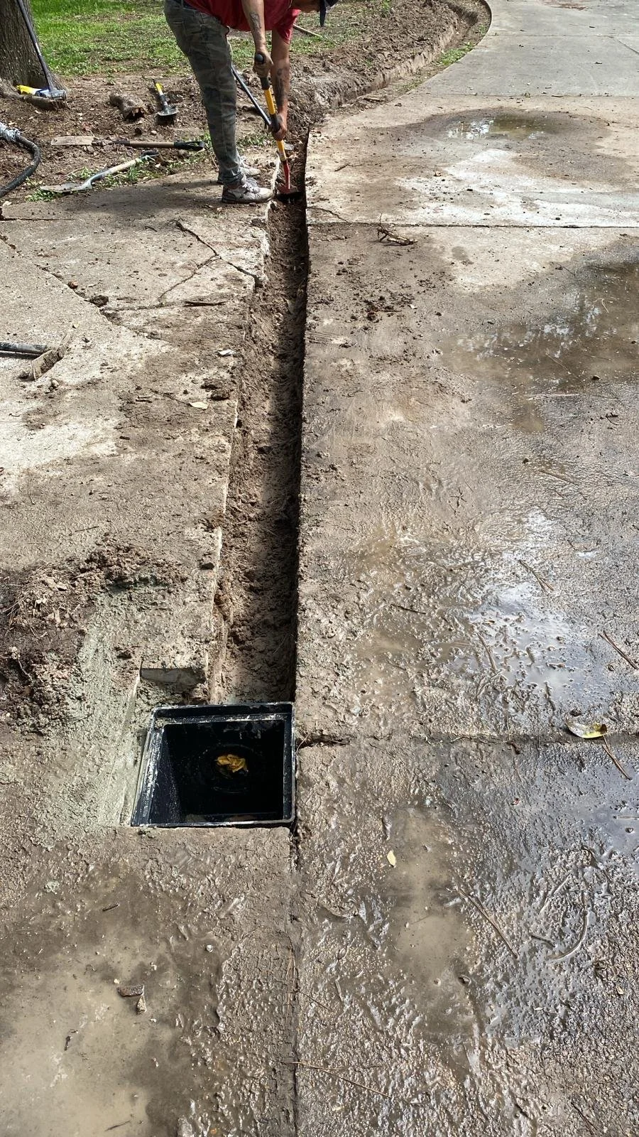 Excavation: We cut a trench across the hardscape or along its edge where the drain will be installed.